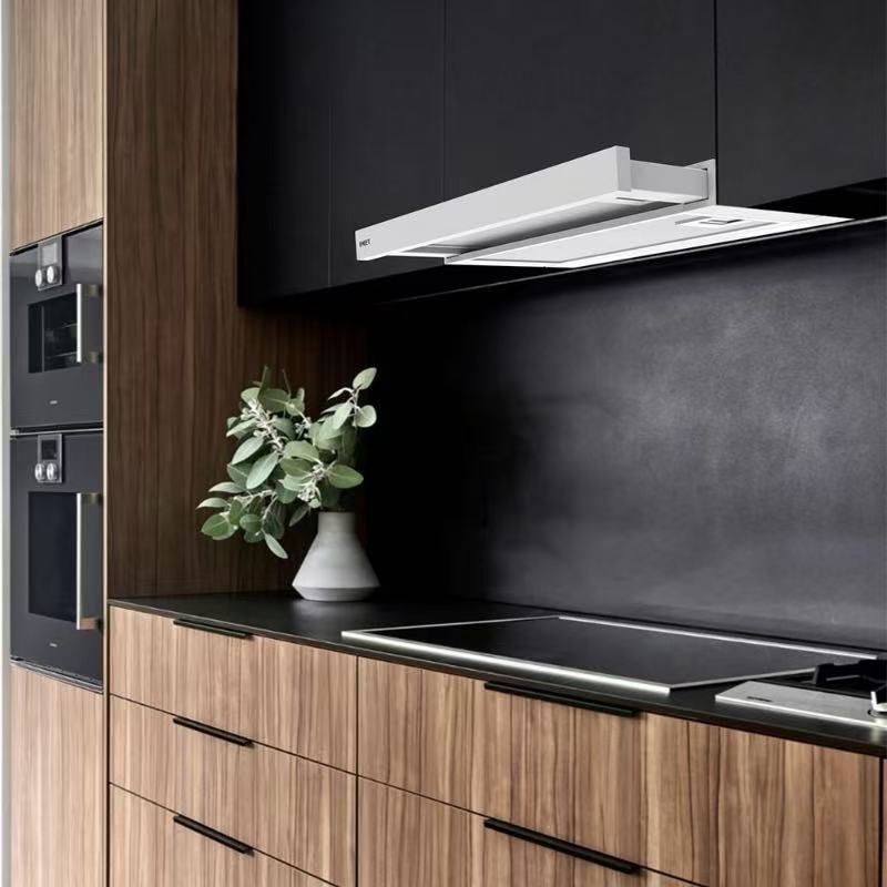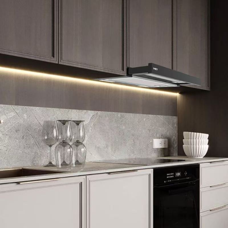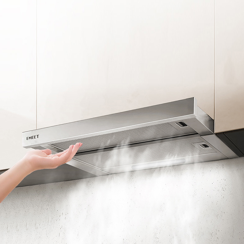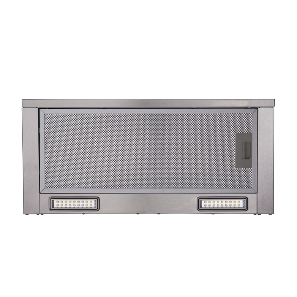 Can be circulated internally or discharged externally. The third-generation range hood features a fully stainless steel panel, automatic switch control, metal dual impeller with metal volute, aluminum shell high-efficiency motor, mesh oil collection, and LED dual light lighting system.