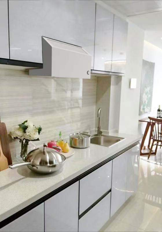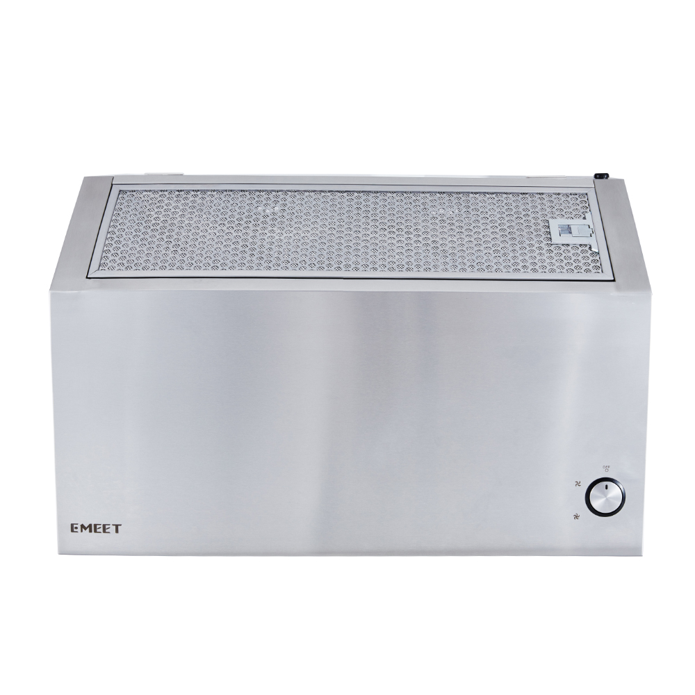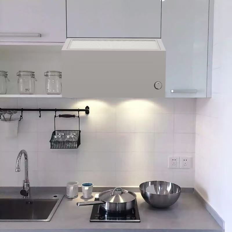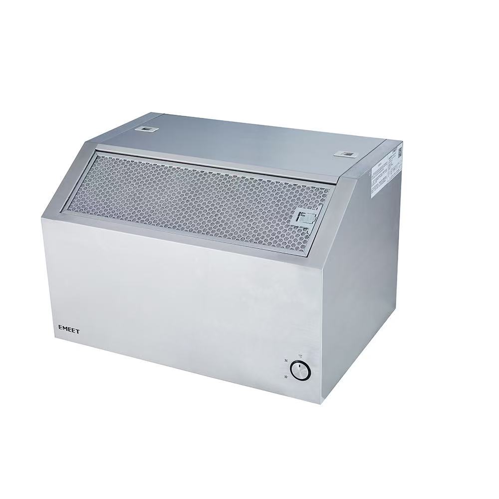 Internal circulation oil fume purifier, ultra-thin body, suitable for independent installation, all stainless steel body, top inclined air outlet; Telescopic secondary electronic switch control; Adopting a vertical metal dual rotor high-speed centrifugal oil throwing fan to purify the oil fume mixture in five stages; Equipped with oil fume circulation pressure reducing chamber; Adopting a long-life LED dual lamp lighting system.