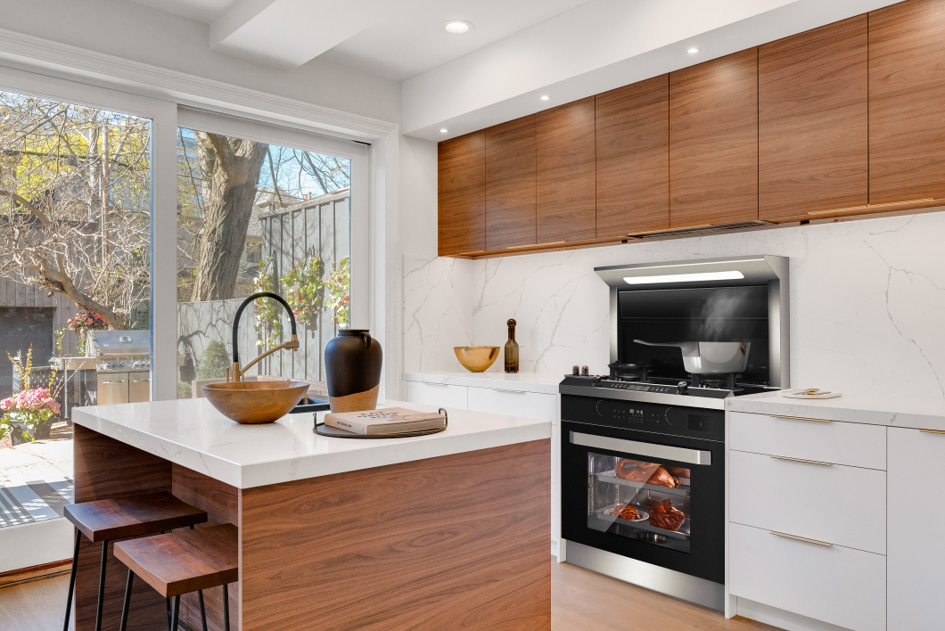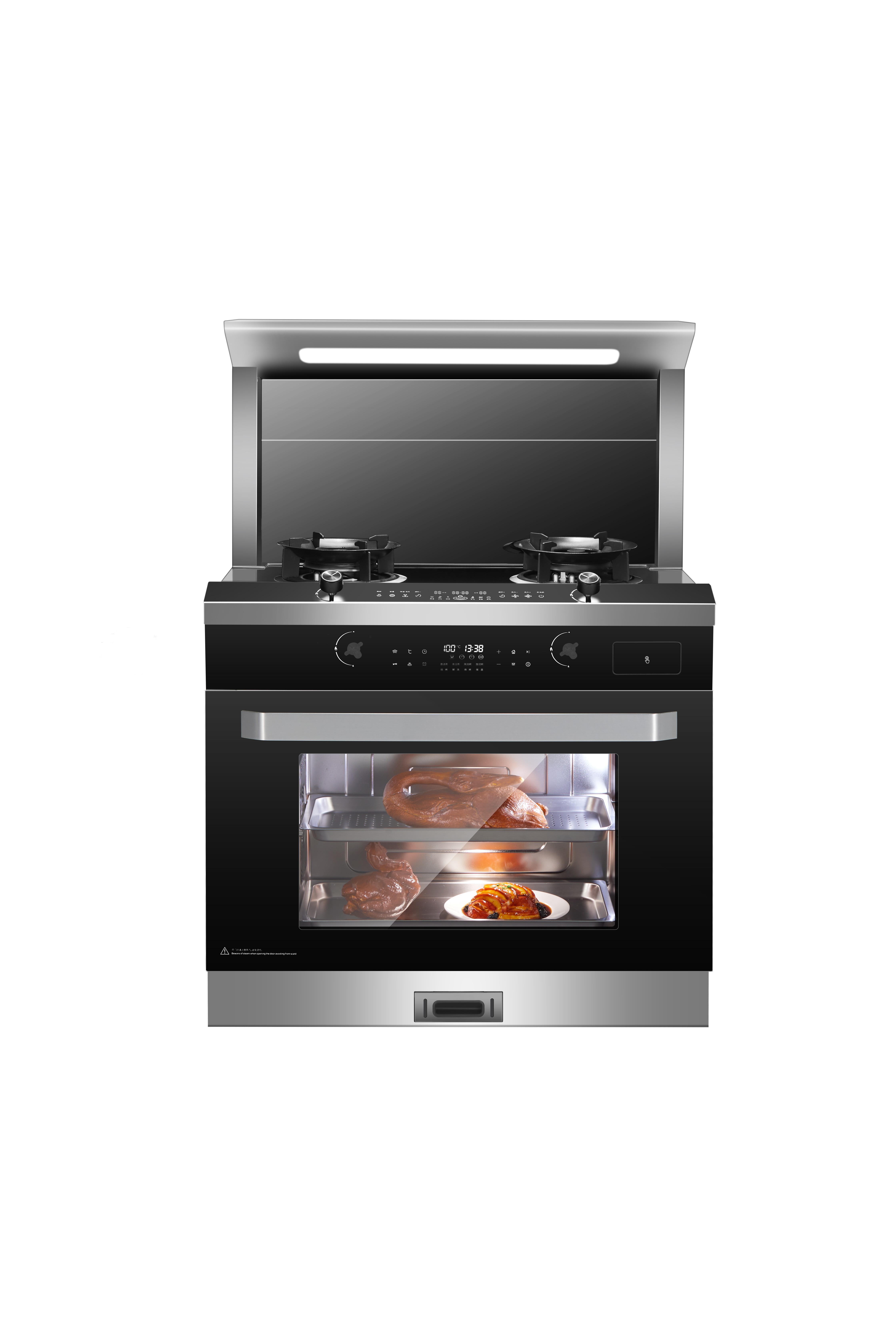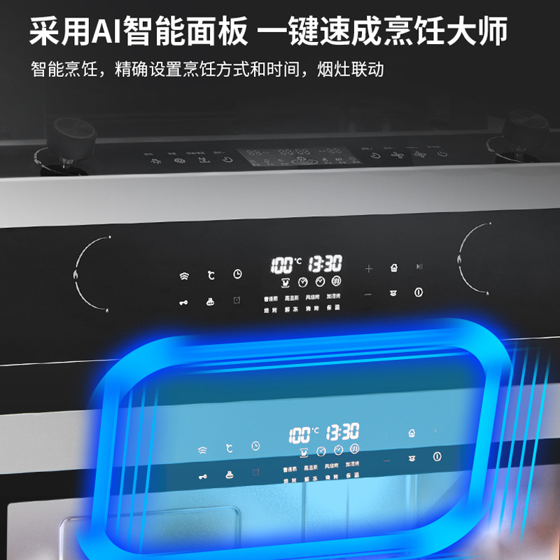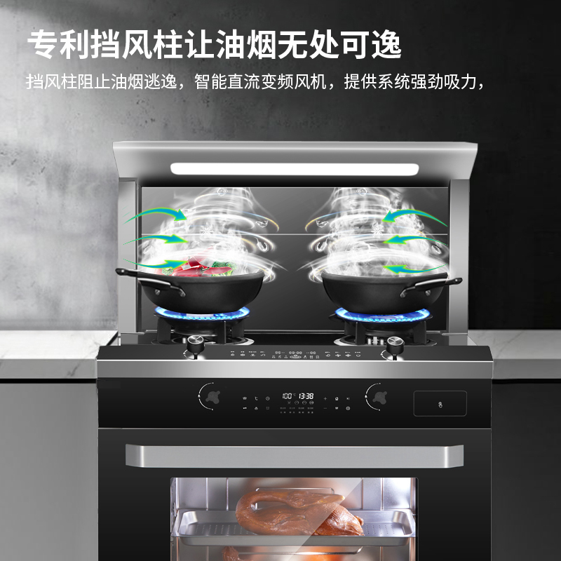 圆弧烟罩,动感时尚;经典凸台控制面板,免弯腰操作便捷;智能语音触摸操控中心,烟灶联动,风压自动调整,风机智能热清洗;全域LED灯光照明,双炉头电子定时设置;设有专利挡风柱,稳定负压区阻挡油烟逃匿:采用纯上进风悬浮燃烧器,防止面板爆裂;直流变频风机,吸力强劲噪音低:吸气口电动翻转:一体风道结构设计;烟罩顶部设有保温板,方便热菜保温:大容量蒸烤箱,Al蒸烤模式控制,操作简单,360°蒸烤,120°锁鲜速蒸;外置水箱,补水便捷;设置有防火墙、熄火保护、童锁保护等十二大安全防护装置,保驾安全。