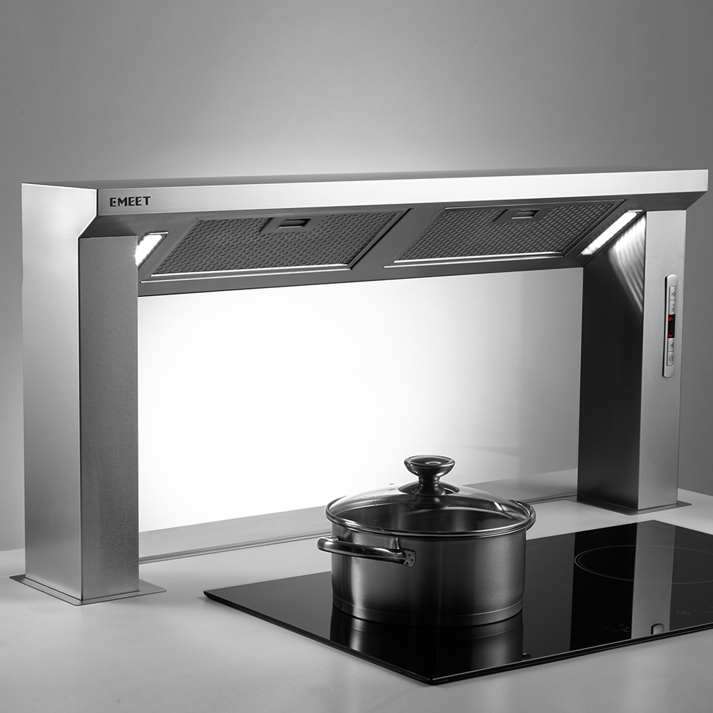 台嵌式油烟机,适合安装在台面上,精致不锈钢框架,全透明玻璃视窗,烟罩橱架双重利用;下排油烟管道设置。