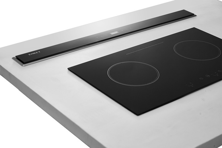 将油烟机嵌入安装在台面上,使用时升起,不使用时下降隐藏在橱柜内,拓展厨房空间,简约而不简单,打造现代智能厨房新美学