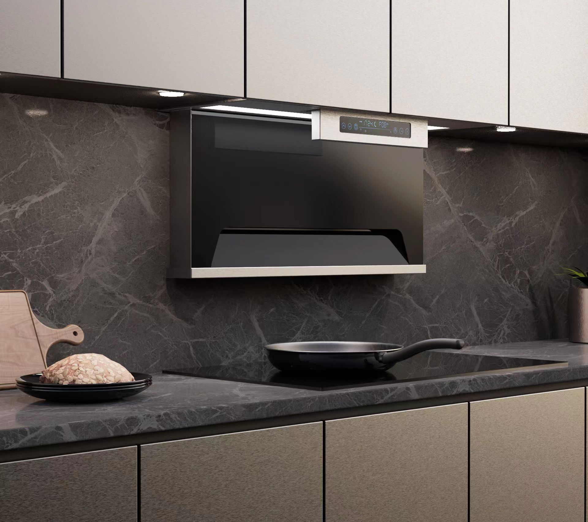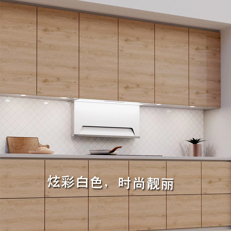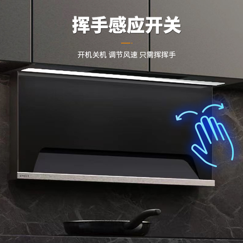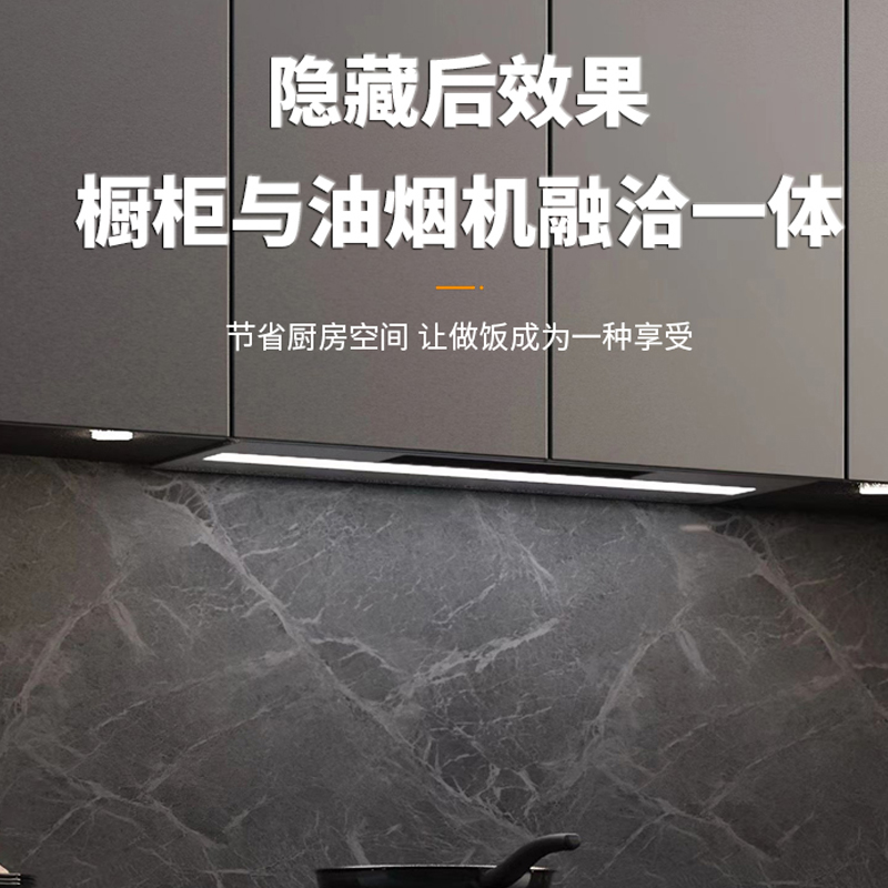 隐形自动升降油烟机,全嵌入结构,油烟机整机隐藏在吊柜内,变有形为无形;工作时自动贴近锅具近吸油烟,不工作时整机隐藏在吊柜里,让厨房视野开阔。双吸气口吸气,下吸气口近灶具吸油烟机,上吸气口收集逃逸余烟。