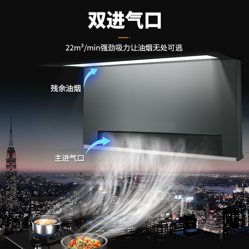 3、双吸气口吸气,下吸气口近灶具吸油烟机,上吸气口收集逃逸余烟,