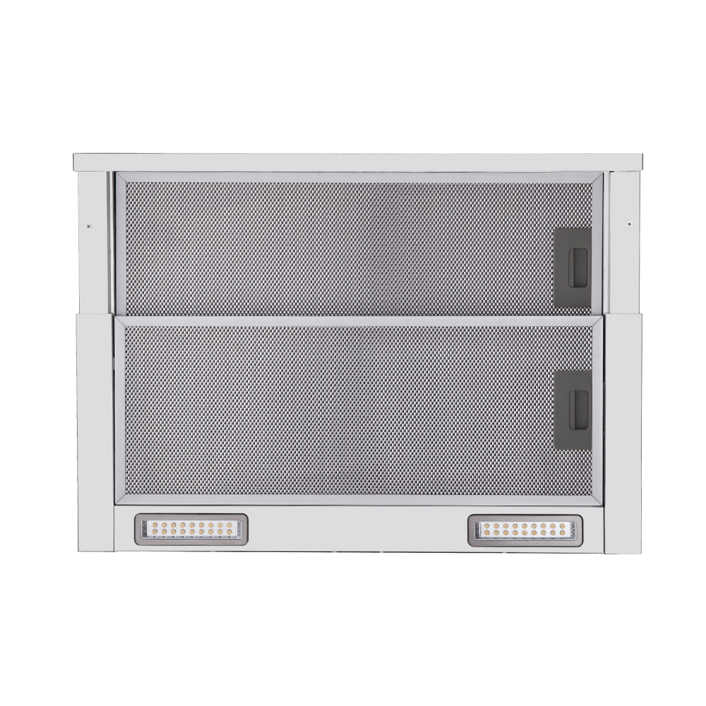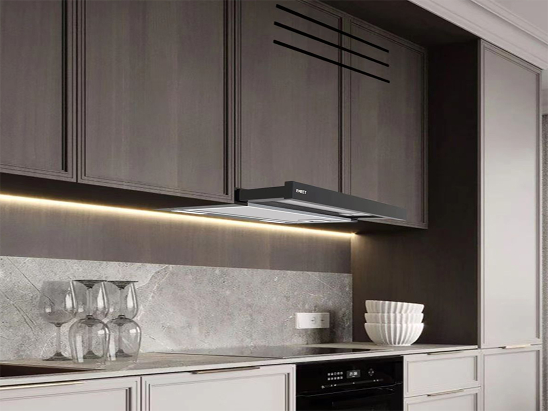 公寓专用内循环油烟净化机,嵌入安装在吊柜内,不锈钢面板、黑色面板和白色面板可选,满足客户个性化需求;抽拉式结构,自动行程开关控制,采用油脂过滤网、活性炭除味网和离心风机对油烟进行三级净化;橱柜门板或者顶板上需开出气孔,实现气体循环。
