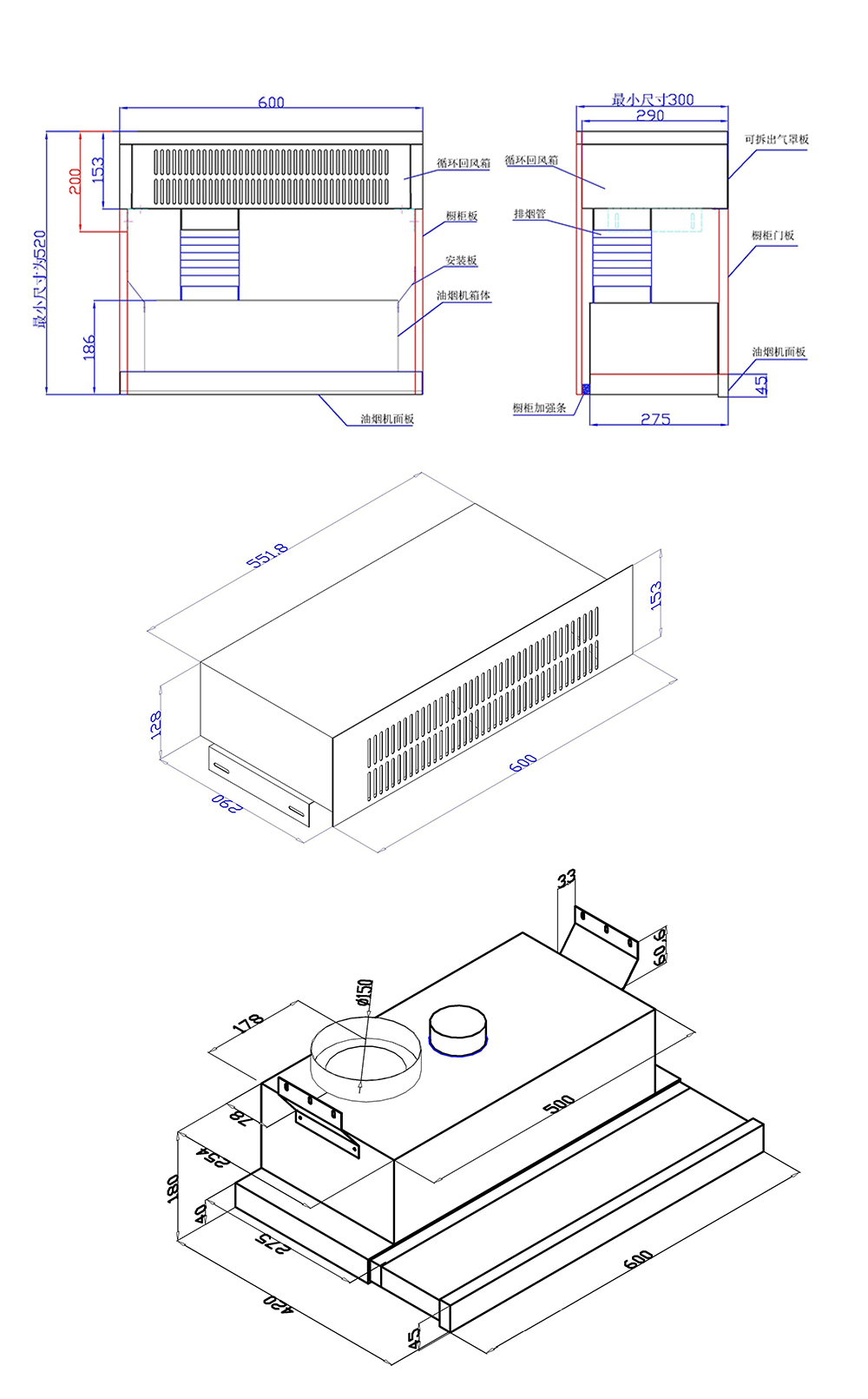 1、带回风箱内循环油烟净化机,嵌入安装在吊柜内,